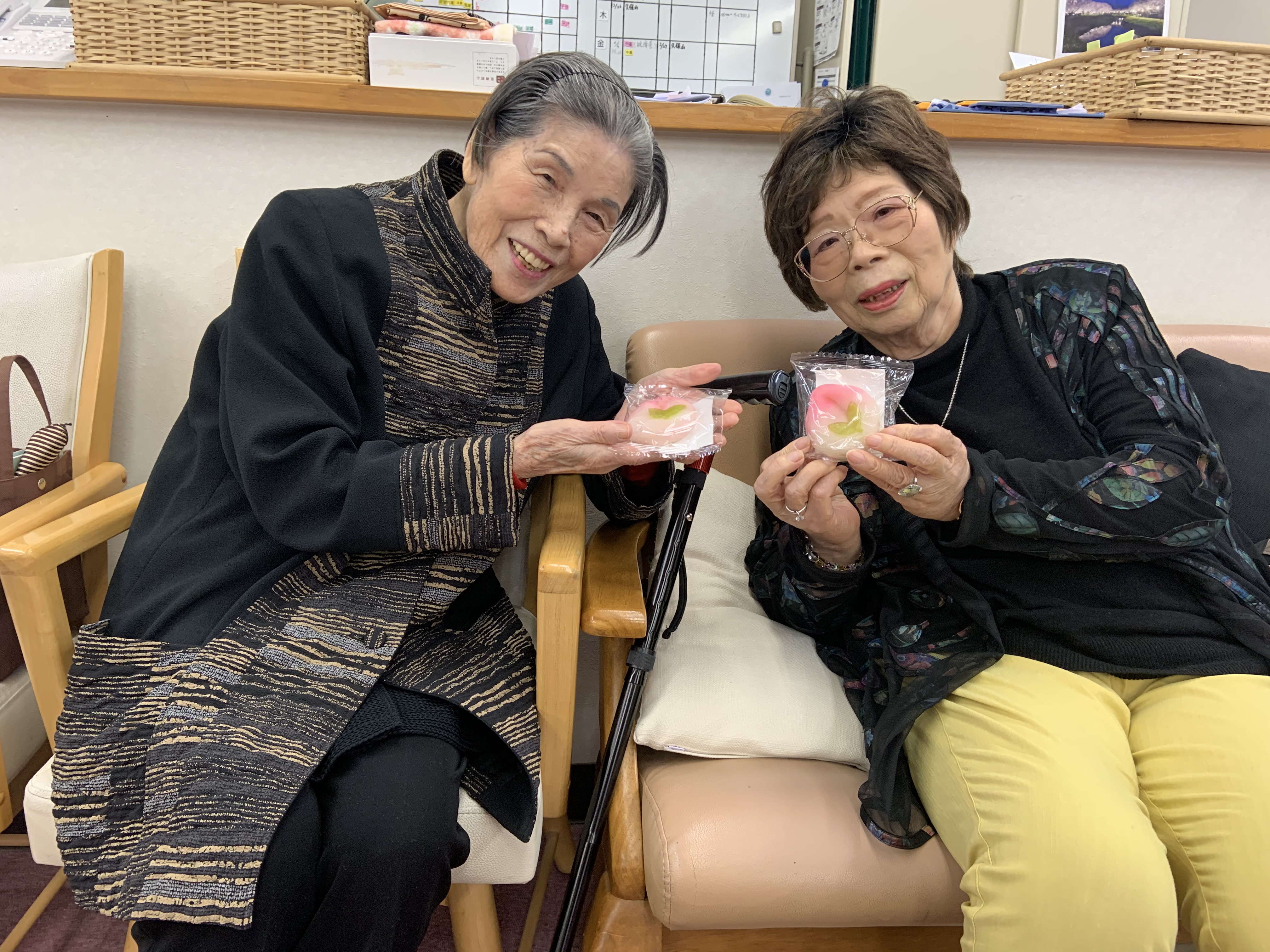 桃の形のおまんじゅうを召し上がっていただき