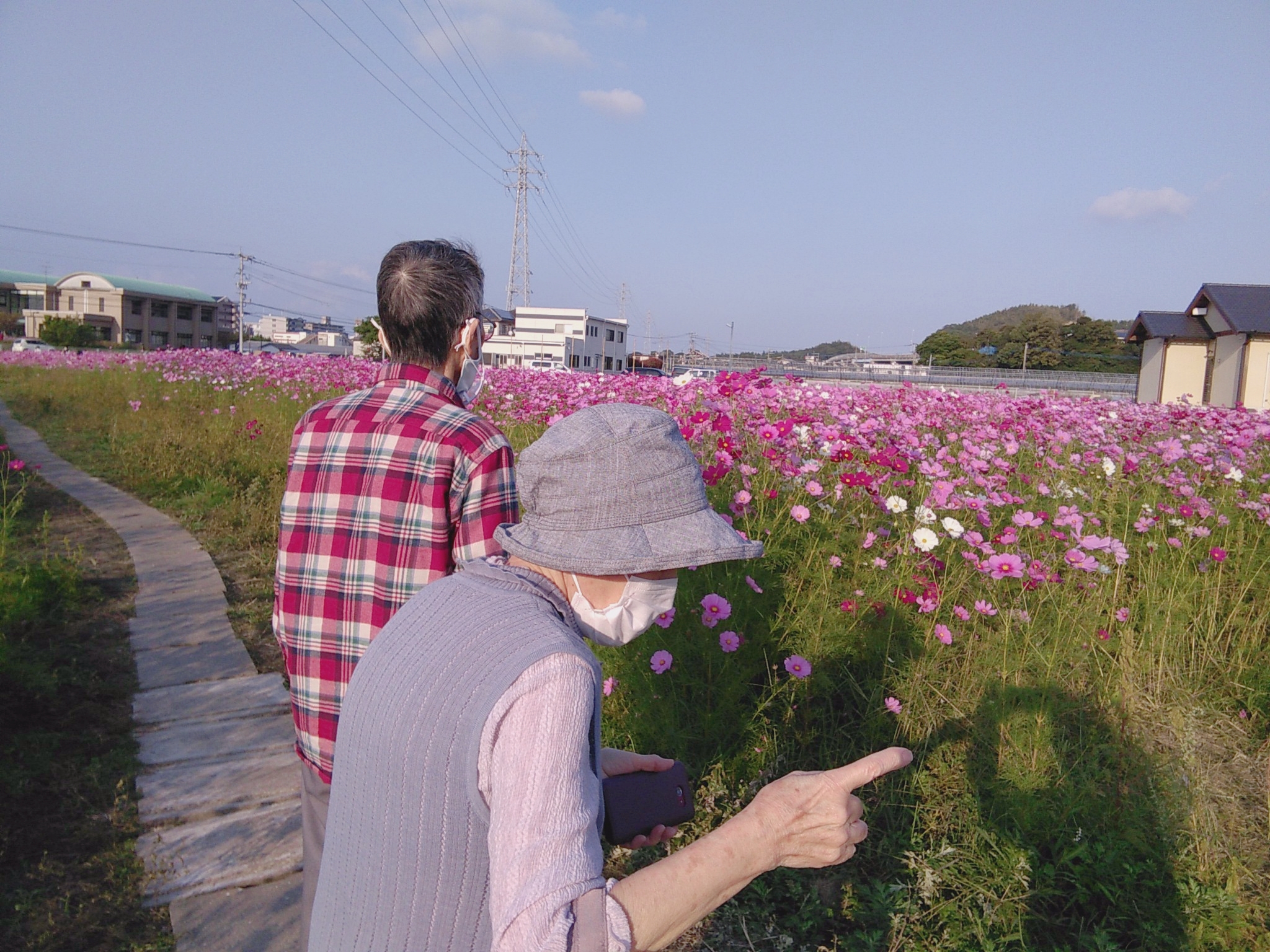 皆様、とても喜ばれ、心行くまでコスモスを見て、楽しそうにお話しされていました。