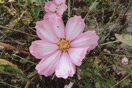 一株だけ、周りをピンクに縁どった珍しいコスモス見つけました。