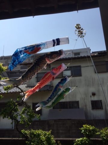 真鯉、緋鯉、子供たちがこいのぼりの歌と同じように気持ちよく泳いでいます。