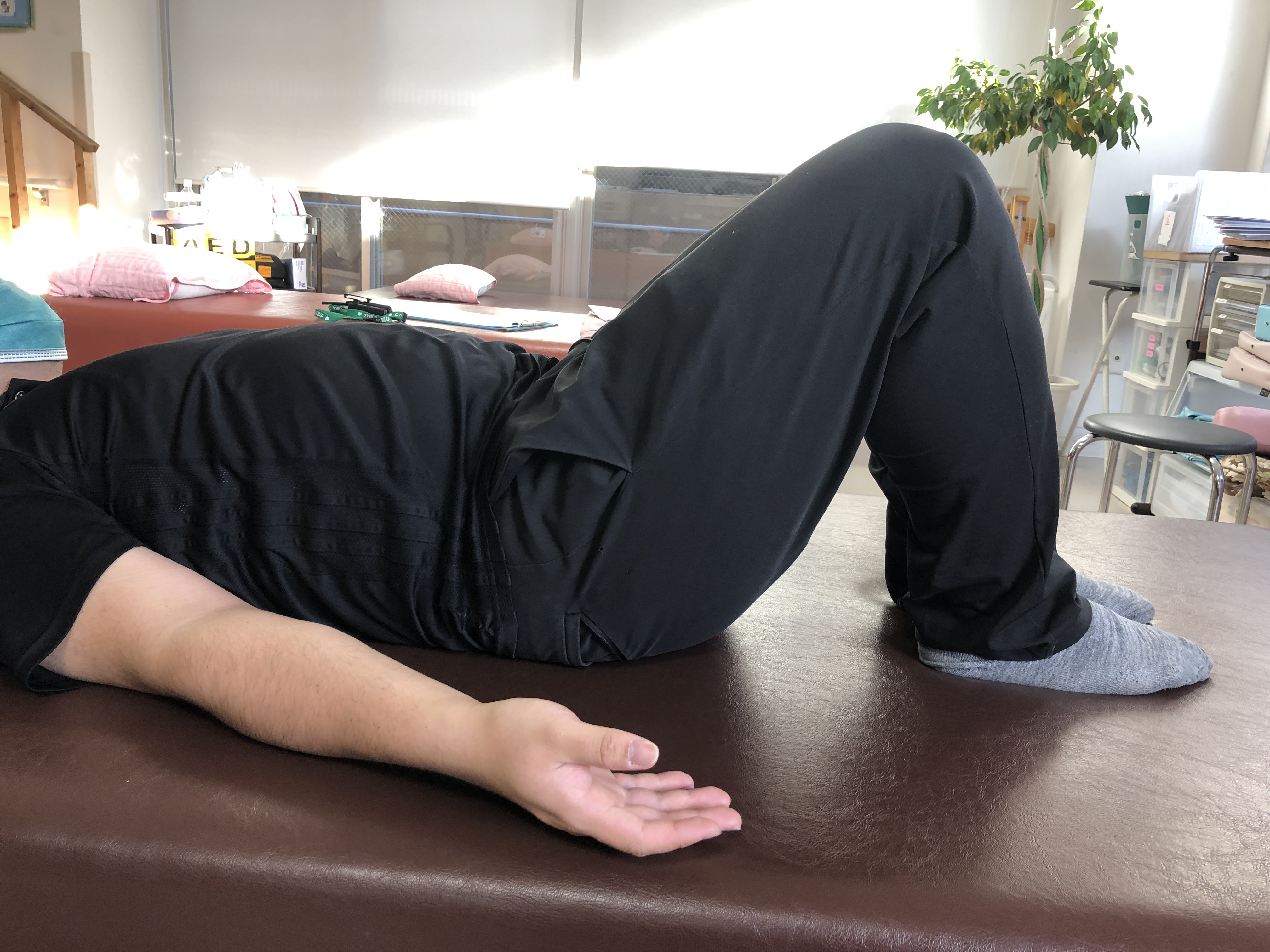 ①仰向けの状態で膝を曲げて足を肩幅程度開きます。