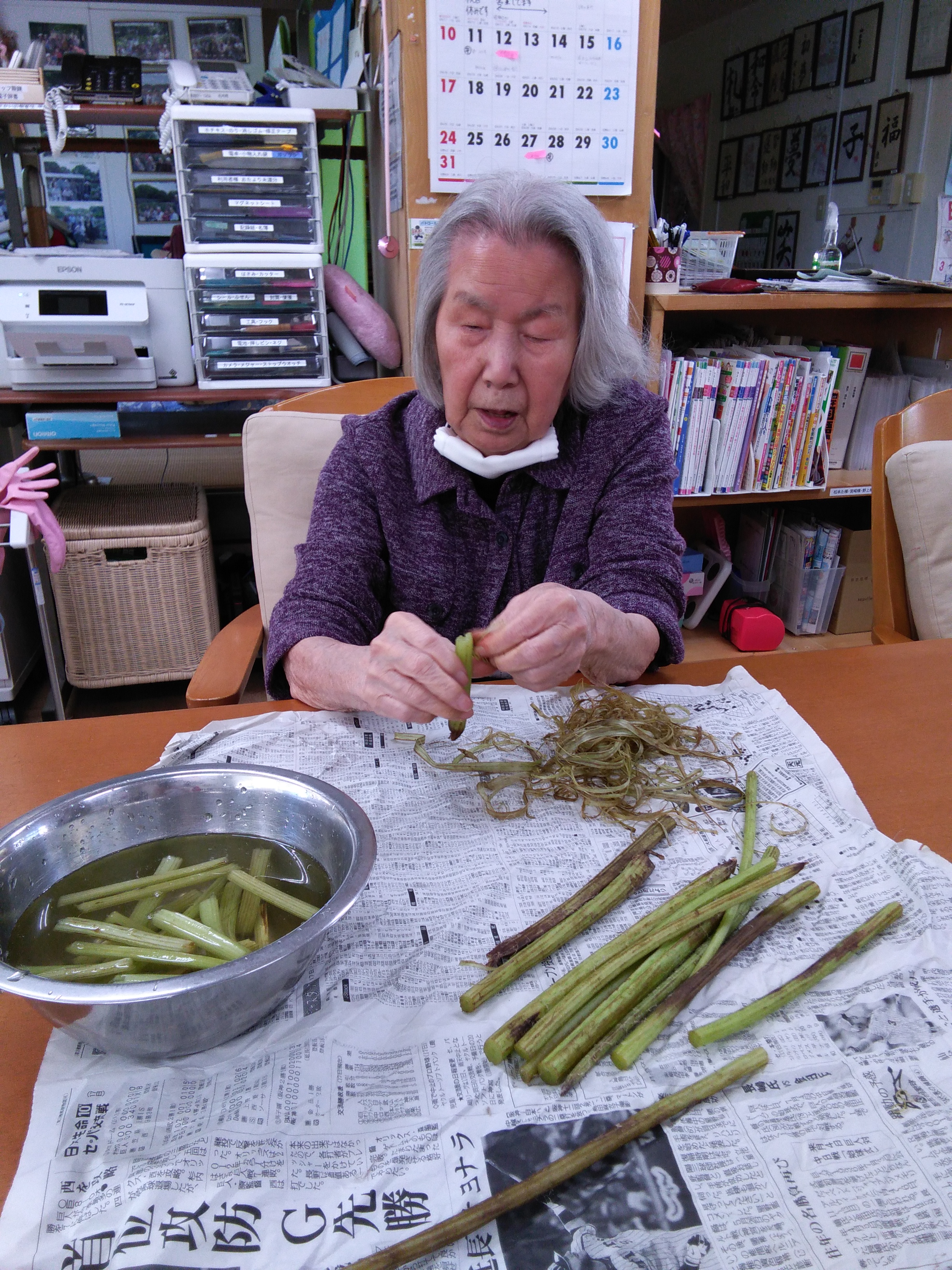 今日は季節の野菜、ヤングコーンの皮むき、フキのすじ取りです。