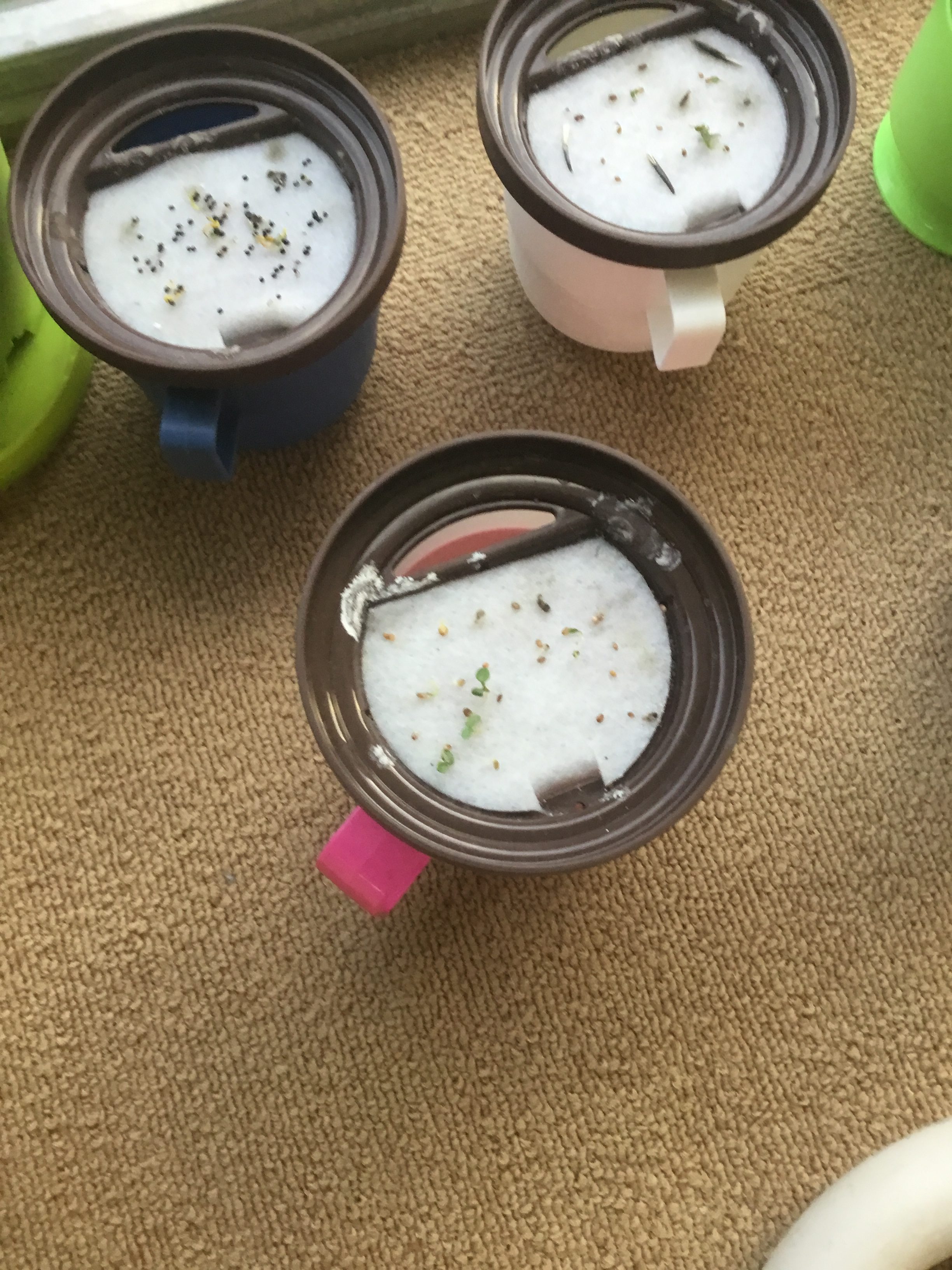 ペットボトルや、マグカップに水耕栽培できる種が植えてあります。