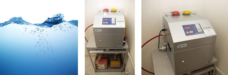 生成装置内で次亜塩素酸ナトリウムと希塩酸を水で薄め、混合して生成する除菌・消臭用水です。